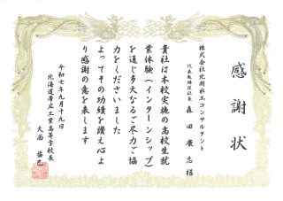 令和7年9月30日、帯広工業高等学校より高校生就業体験(インターンシップ)への尽力と協力に感謝状をいただきました。