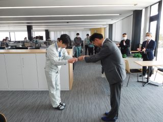 昨年4月に育児・介護休業法が改正され、産後パパ育休が創設される等、社会全体で少子化に対応しようとする流れが定着しつつありますが、当社では、新たに出産祝い金(金額10万円)を設けることとしました。第1号は、3月4日に第2子が誕生した相馬尚翔君(本社環境調査計画部環境計量グループ)で、3月27日に手渡しました。相馬君は4月15日から1カ月の育児休暇に入ります。