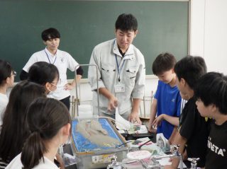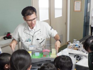 児童らには、利別川のふだんの様子と増水した時の様子を写真で比べたり、増水中の川で起こっている河岸が削れる様子を動画で確認してもらったのち、弊社で所有している「流水模型」「内水氾濫模型」「河川模型(遊水地・ダム)」を見てもらい、最後に災害情報を見聞きしたら親御さんと必ず避難することを確認しました。
