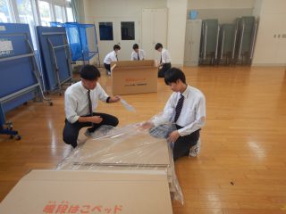 授業の初め、快適だと思う避難スペースはどれくらいの広さなのか・プライバシーはどうしたら守れるのか等を話し合ってもらい、持ち込んだ段ボールベッドを組み立て、教室にある物を使って作成。その後、能登半島地震などでの実際の1人分のスペースを提示し、その狭さに快適、安全・安心とは何かを考えさせられた様子でした。