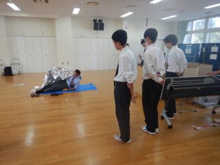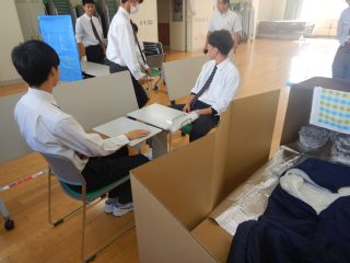 この授業では、身近な地域の防災・減災について快適で安心・安全な避難所を運営するにはどのようなことに留意することが大切かを多様な視点で考察しました。同校では1学年で避難所運営ゲーム(Doはぐ)を行っており、今回は実際に1人分の避難スペースを2グループに分かれて作成することにしました。