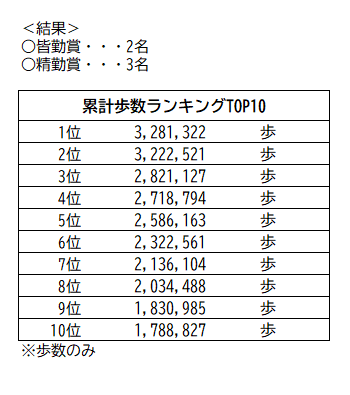 令和7年9月1日から令和8年2月28日の期間(1期9月1日~11月30日、2期12月1日~2月28日)で開催していました社内ウォーキング企画「徒歩き-かちあるき-」が終了しましたので、結果をお知らせします。